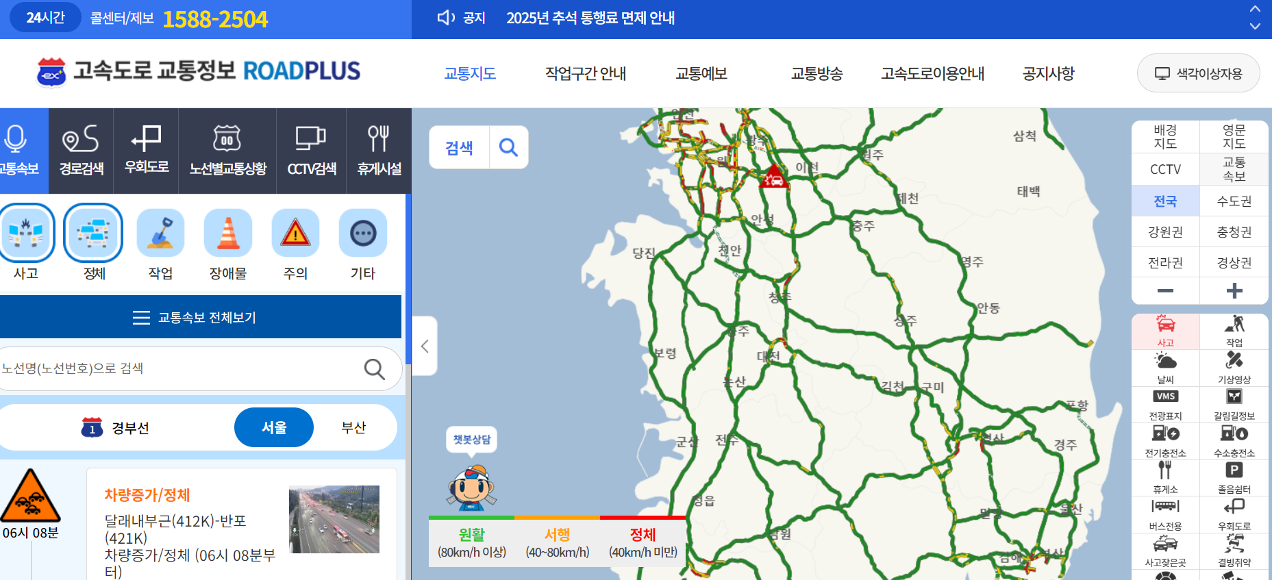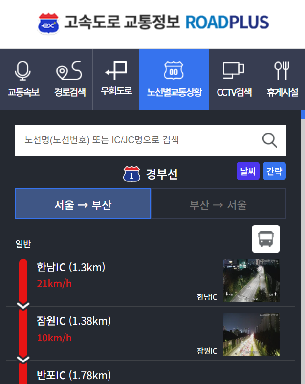🚗경부고속도로는 상행선(부산 → 서울), 하행선(서울 → 부산) 어느 방향이든 특정 구간에서 정체가 반복적으로 발생하기 때문에, 미리 교통상황을 확인하지 않으면 도로 위에서 많은 시간을 허비할 수 있습니다.