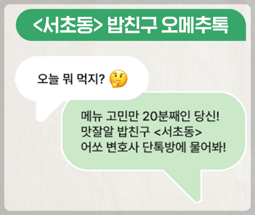 오늘 점심 메뉴 고민하는 당신? ‘서초동 밥친구 오메추톡’에 들어가면 어쏘 변호사들이 맛집 추천을 해줍니다.