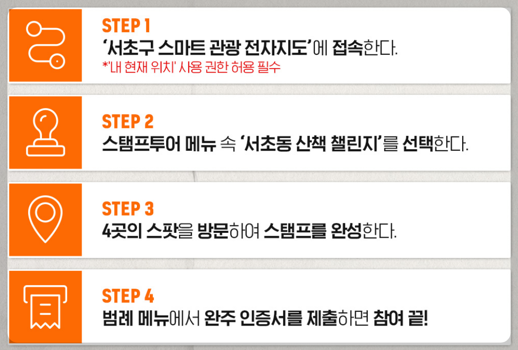 - 스탬프투어 메뉴에서 ‘서초동 산책 챌린지’ 선택