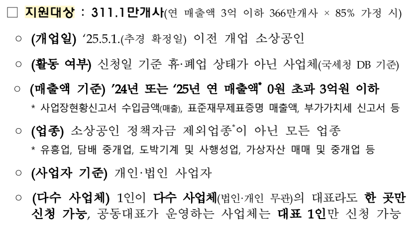 - 지원 대상: 연매출 3억 원 이하 소상공인