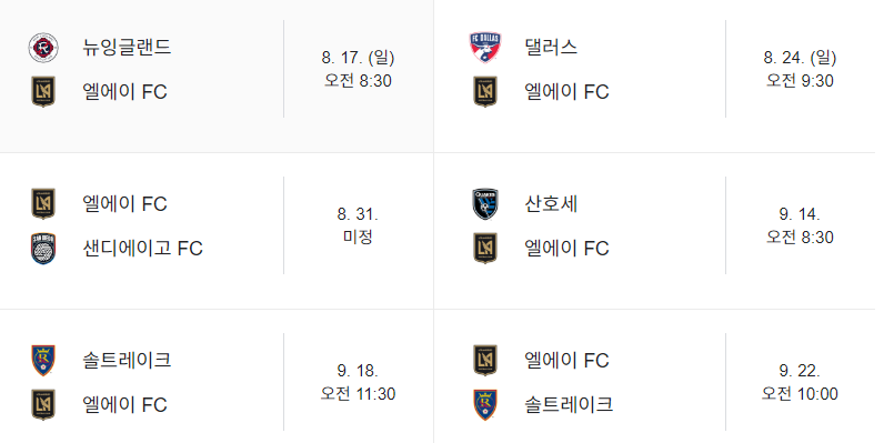 | 8월 31일 (토) | LAFC vs 샌디에이고 | 오전 11:30 | BMO Stadium (홈) |