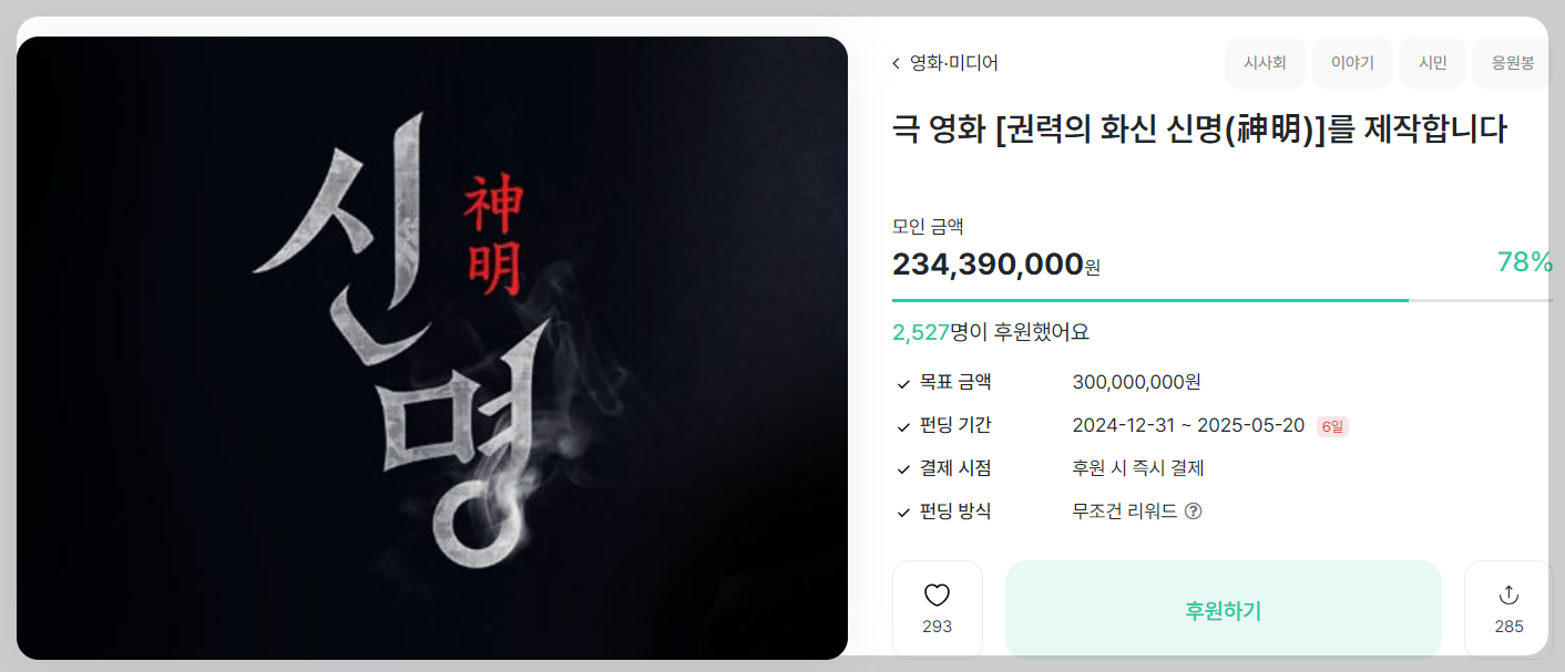 그에 비해 <신명>은 📢 자본 없이 시민 후원으로 제작되었으며, 대기업 배급 無 / 홍보비 無, 오직 시민의 전화, 예매, 입소문만이 유일한 생존 수단이라고 합니다!