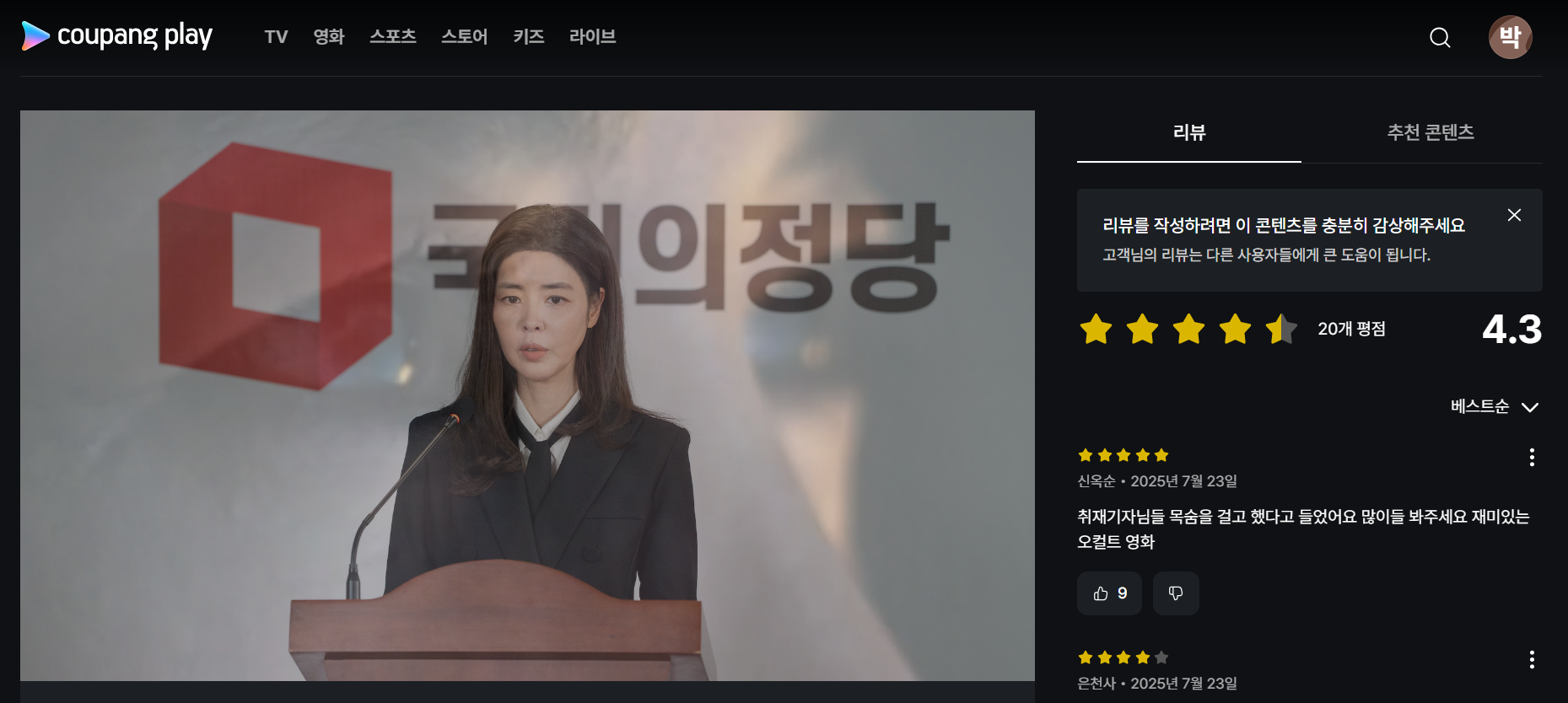 하지만 다행히도 쿠팡플레이, WATCHA, wavve, U+모바일TV 등에서 단품 결제 방식의 VOD 서비스가 개시되어, 영화를 빠르게 시청하고 싶은 분들은 바로 감상이 가능합니다. 특히 쿠팡플레이는 UI가 직관적이며, 모바일뿐 아니라 TV와 PC에서도 고화질로 감상할 수 있어 추천드립니다.