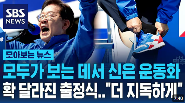 이재명 후보가 운동화를 신은 모습이 언론과 SNS에서 급속도로 확산되며 관심이 집중됨 - SNS 인증샷 붐