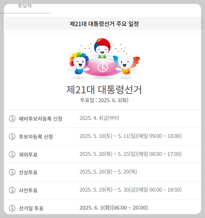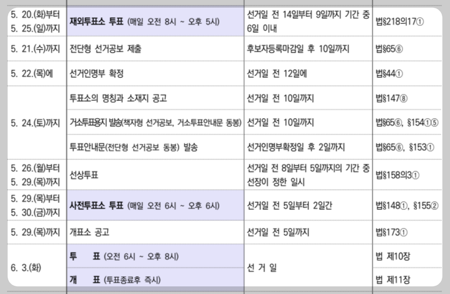 | 재외투표 | 2025. 5. 20(화) ~ 5. 25(일) | 해외 유권자 대상 |