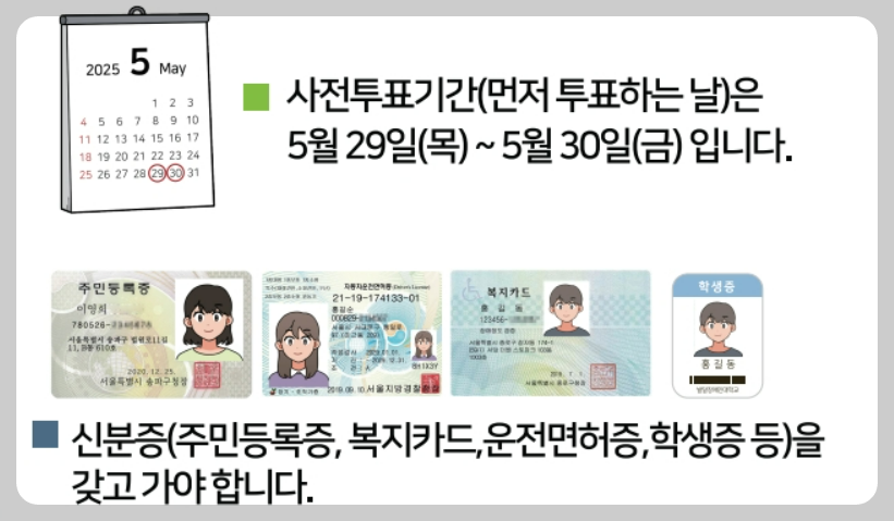 | 사전투표 | 2025. 5. 29(목) ~ 5. 30(금) | 오전 6시 ~ 오후 6시 |
