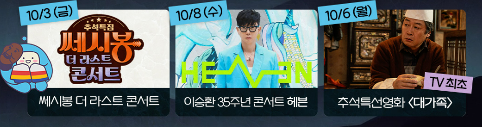 낮에는 아이들과 함께 즐길 수 있는 가족 영화와 동물 프로그램이, 저녁에는 웃음과 감동을 전하는 추석 특집 예능이 준비되어 있죠. 심야 시간에는 명작 영화와 감성적인 음악 무대가 이어져, 누구나 취향에 맞는 콘텐츠를 고를 수 있습니다.