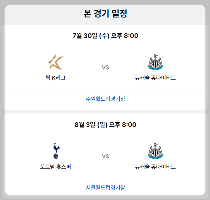2025년 여름, 프리미어리그 우승 팀들이 한국에 옵니다! 바로 EPL 명문 토트넘 홋스퍼와 뉴캐슬 유나이티드의 맞대결이 오는 8월 3일 서울월드컵경기장에서 열리는 것인데요! 이번 경기는 단순한 친선전이 아닌 유럽 우승팀 간의 챔피언 매치로 축구 팬들 사이에서 벌써부터 티켓팅 전쟁이 예고되고 있습니다.