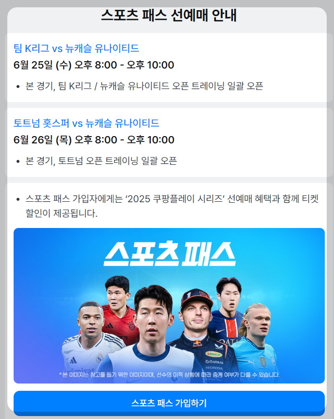 | 선예매 | 6월 26일(수)오후 | 오후 8시 | 쿠팡 스포츠패스 가입자 |