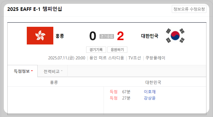 | 한국 홍콩 축구 중계 동아시안컵 경기 ✅ (4) | 2025.07.11 |