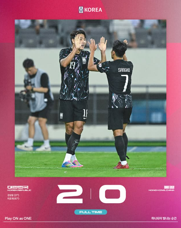 여러분은 이번 홍콩전에서 어떤 장면이 가장 인상 깊으셨나요? 강상윤의 침착한 오른발, 이호재의 헤더골, 홍명보 감독의 교체 실험이 인상 깊었는데요. 다음 경기에서도 우리 국대선수들이 박진감넘치고 멋진성과를 보여주면 좋겠습니다.😊