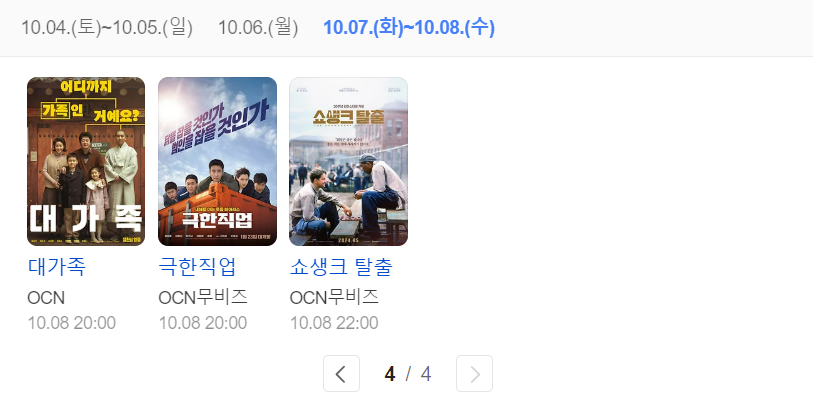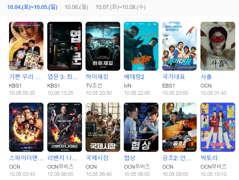 (방송사 표기 포함: OCN, OCN무비즈, SBS, MBC, EBS, KBS1, KBS2, TV조선, tvN, MBN 등)