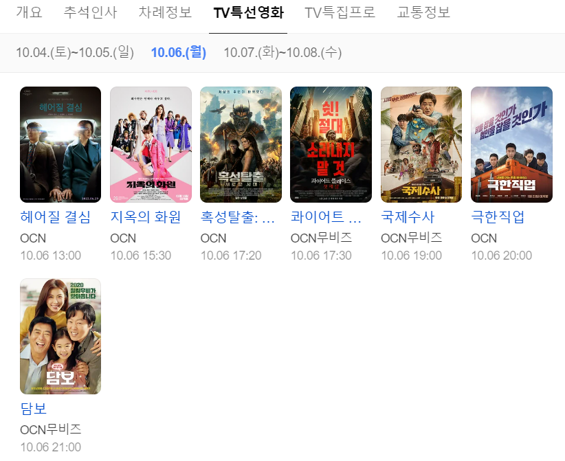 A. 대부분의 방송사는 OTT나 공식 VOD 서비스를 통해 특선영화를 다시보기로 제공합니다. 또한 OCN, tvN 등 케이블 채널은 추석 이후 재방송도 자주 편성됩니다.