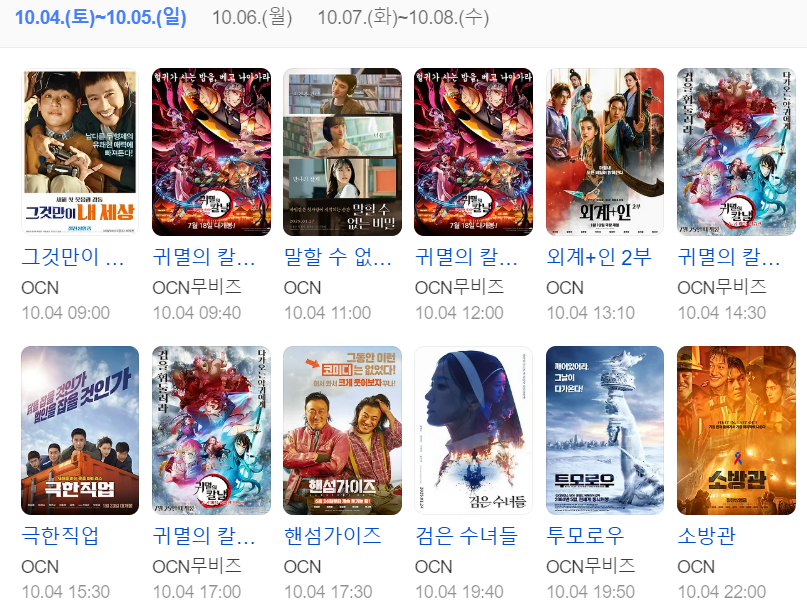 | 심야 | 쿵푸허슬 / 투모로우 / 비공식작전 / 취권2 / 필사의 추격 / 극장판 귀멸의 칼날 등 | OCN/OCN무비즈 |