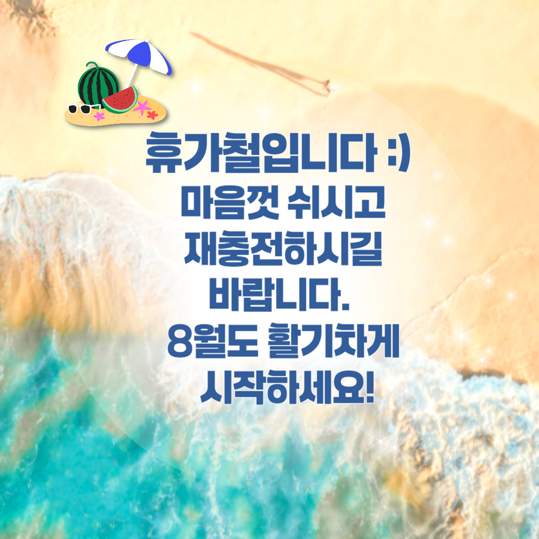 시원한 바다와 함께 재충전의 시간 되시길 바랍니다 :)” - “가끔은 멈추는 것도 필요해요. 이번 여름은 충분히 쉬고 힐링하세요!”